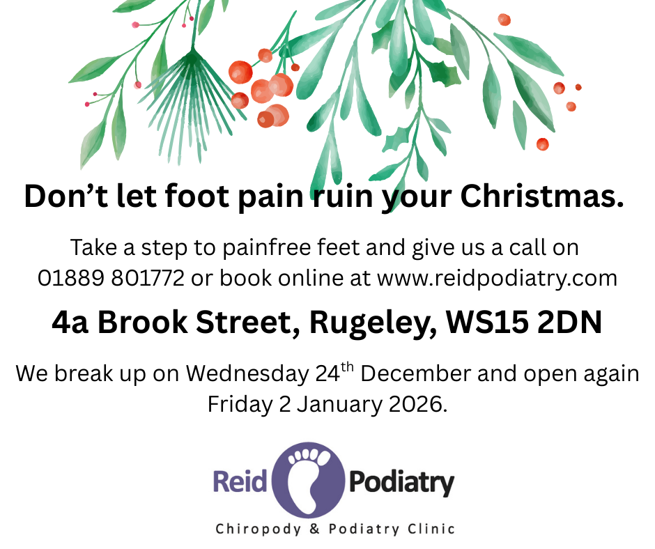 As the festive season approaches, we want to thank all our patients for trusting us with your foot care throughout the year. Wishing you and your loved ones a joyful Christmas filled with warmth, laughter and healthy, happy feet. Should you have any concerns this winter, remember, we’re here to help – because every step counts.